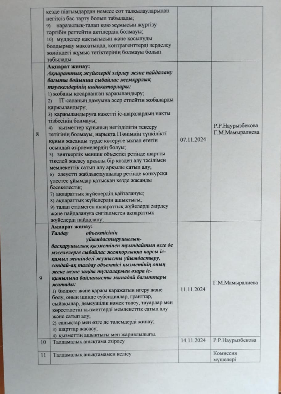 01 октябрь 2024 0 1 2 3 4 5 Сыбайлас жемқорлық тәуекелдеріне ішкі талдау жүргізу жөніндегі жұмыс жоспары.