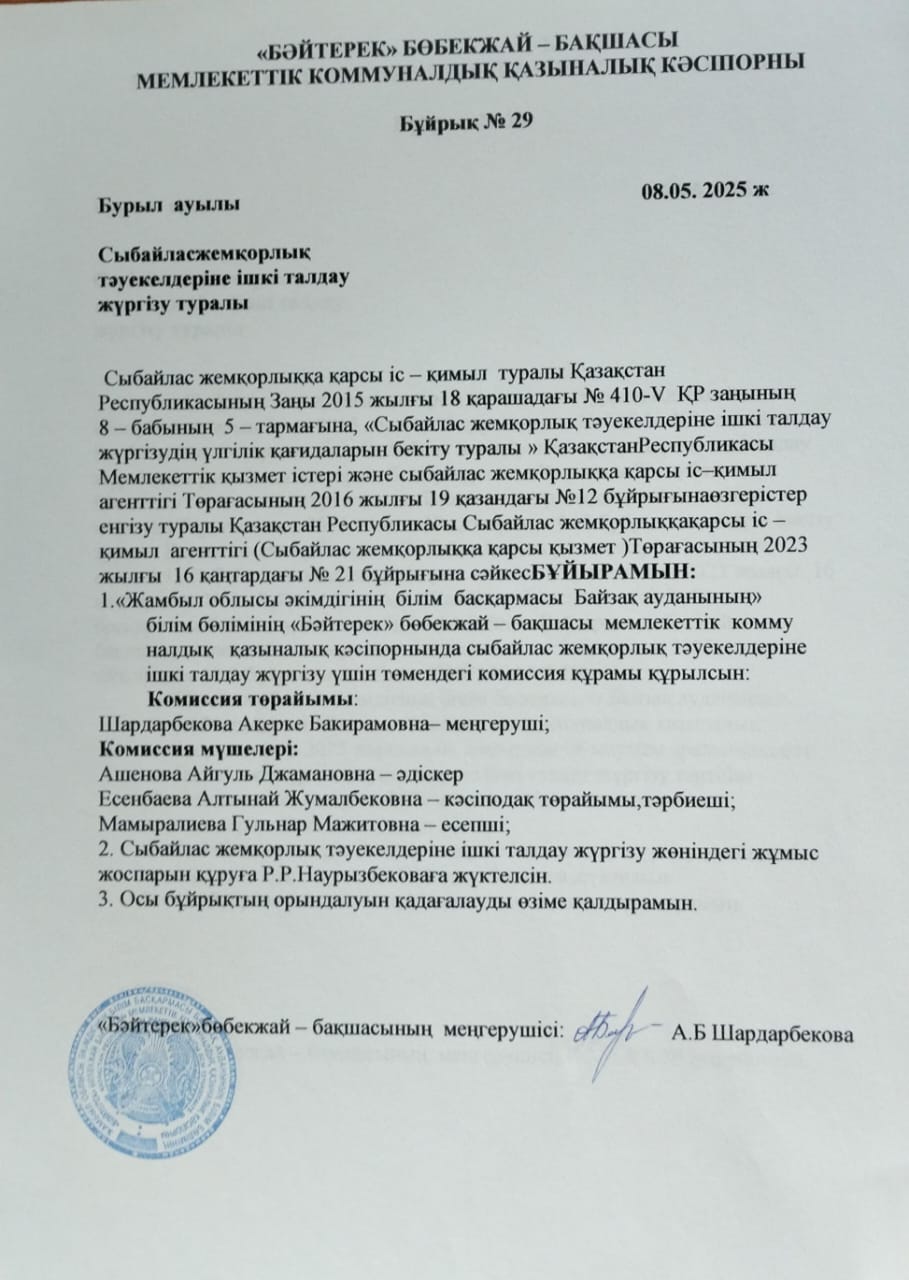 » Сыбайлас жемқорлық тәуекелдеріне ішкі талдау жүргізу туралы бұйрық.